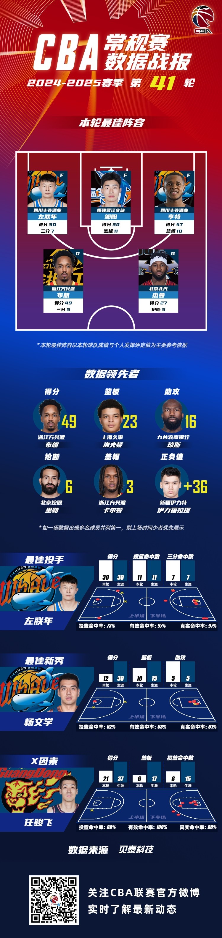 2024-2025赛季CBA联赛常规赛第41轮结束较量,来自四川蓝鲸的左朕年和亨特,福建浔兴的邹阳,浙江广厦的布朗,北京首钢的杰曼入选CBA联赛常规赛第41轮最佳阵容!