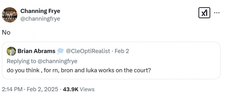 詹姆斯的前队友钱宁-弗莱回答网友问答,当被问及勒布朗和东契奇的组合在场上能否奏效时,他的回答是不能。