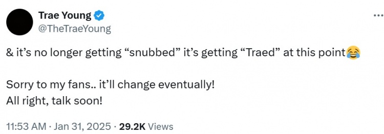 特雷-杨无缘本赛季的全明星,对此,他更推道:“这不是被‘冷落’了,而是被‘特雷-杨’啦。对不住我的球迷们。这迟早会改变的!就这样,回头再聊。”