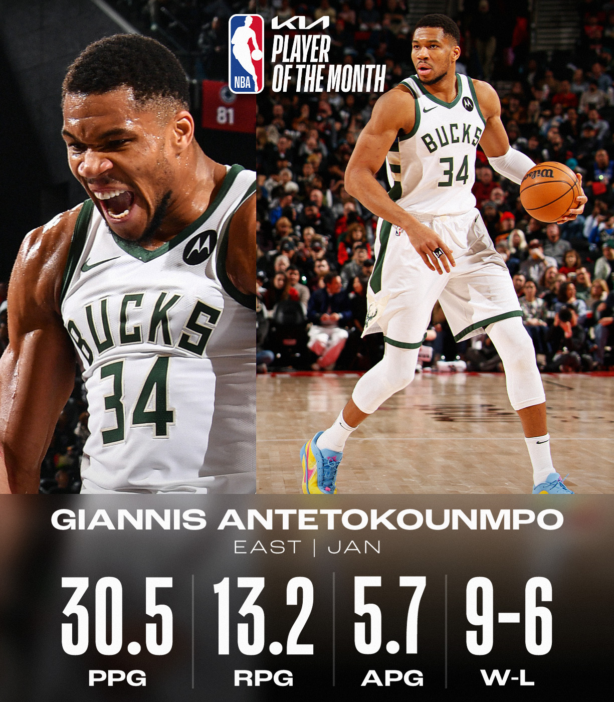 字母哥一月场均:30.5分13.2篮板5.7助攻,出战的比赛雄鹿9胜6负;