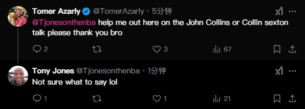 02月06日讯 快船记者Tomer Azarly发推向爵士记者Tony Jones求助:“哥们,快帮我问问科林斯和塞克斯顿的情况咋样?谢谢你了好兄弟!”