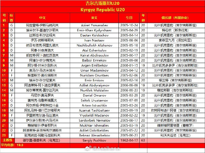2025年中国U20亚洲杯 小组赛 中国vs吉尔吉斯斯坦 两队23人大名单