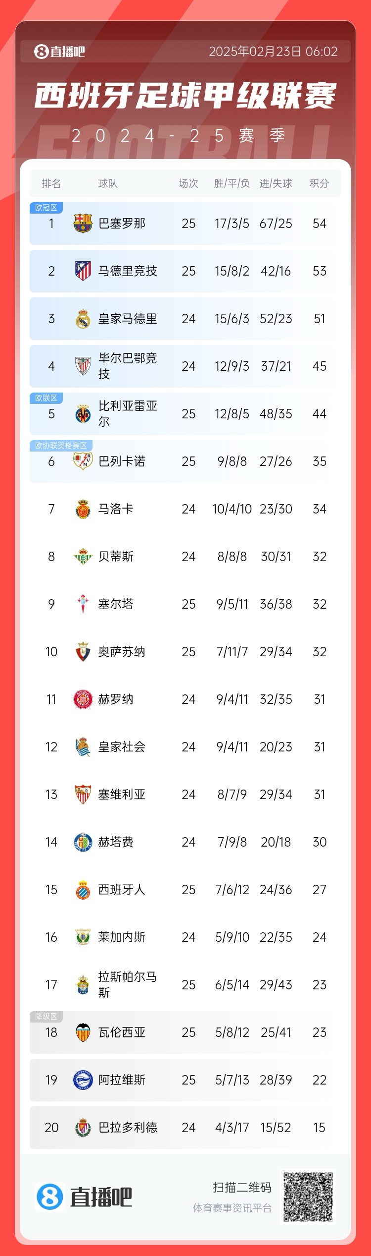 保住榜首!西甲积分榜:巴萨领先马竞1分,领先未赛的皇马3分