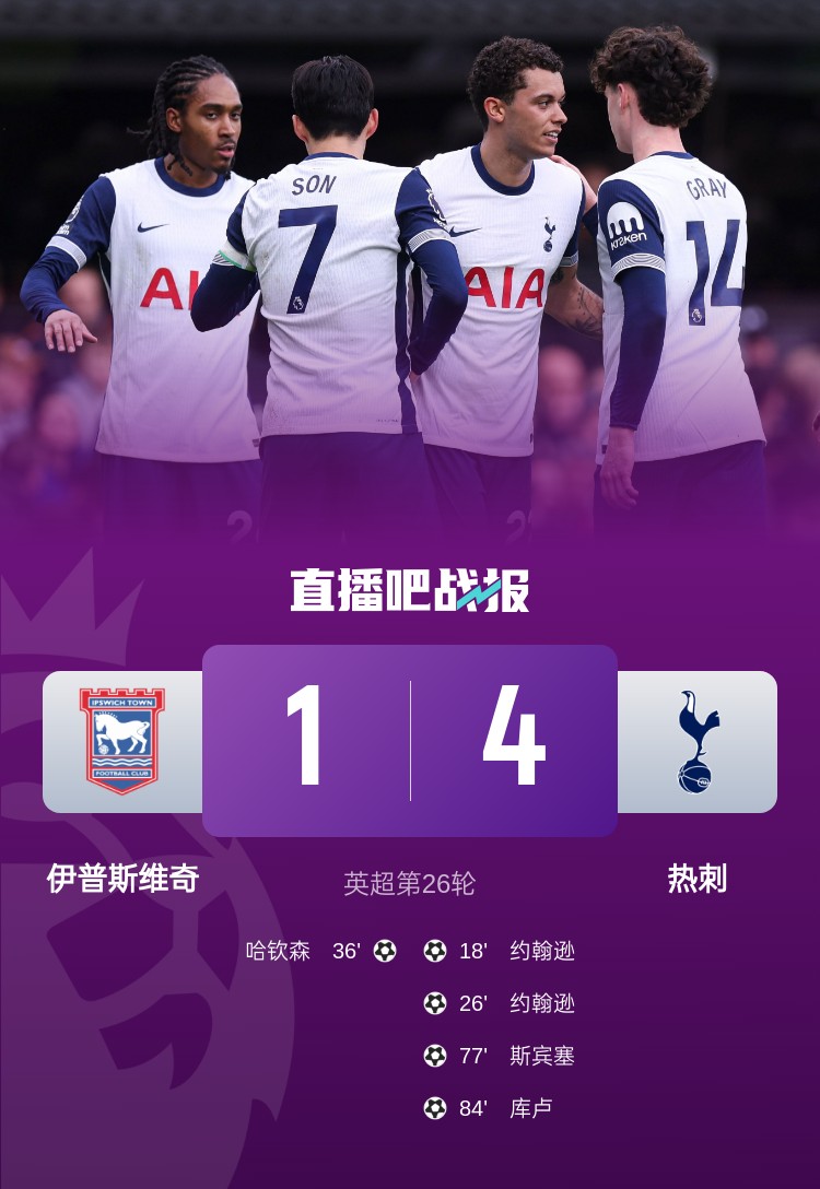 英超第26轮,热刺客场4-1伊普斯维奇取得三连胜,约翰逊梅开二度。