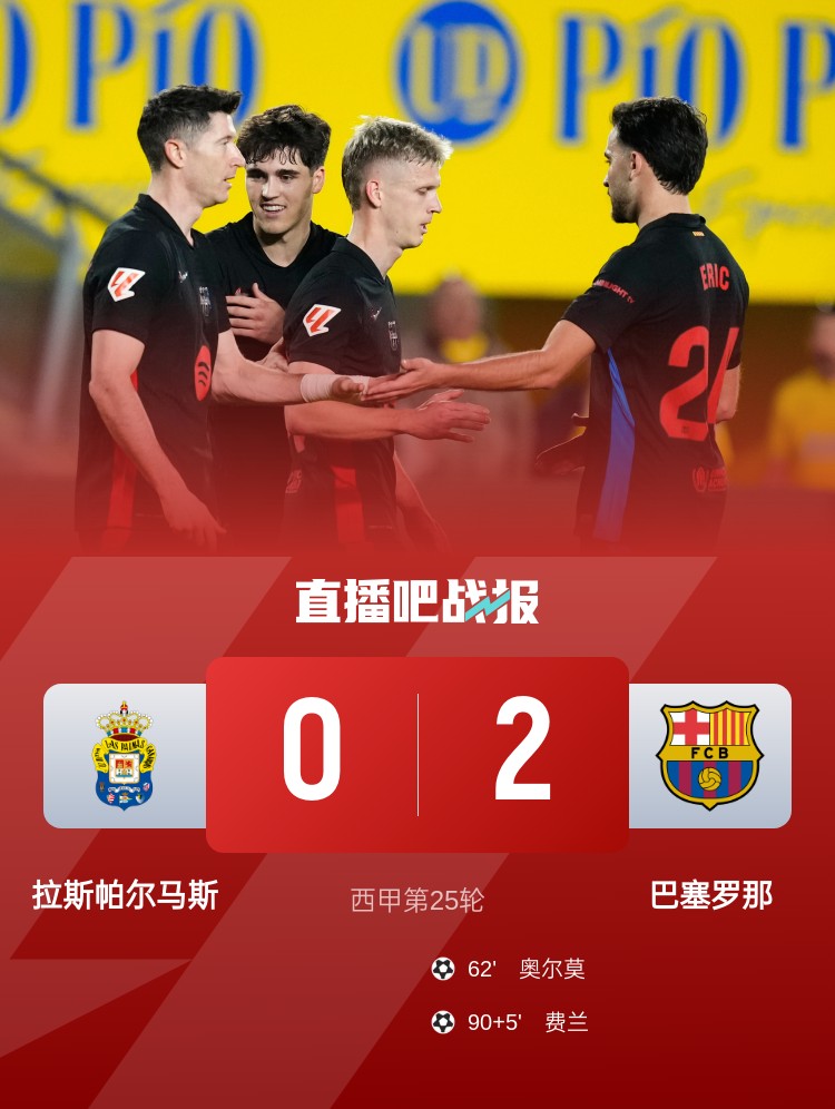 西甲第25轮,巴萨2-0拉斯帕尔马斯1分优势领跑,奥尔莫、费兰进球。