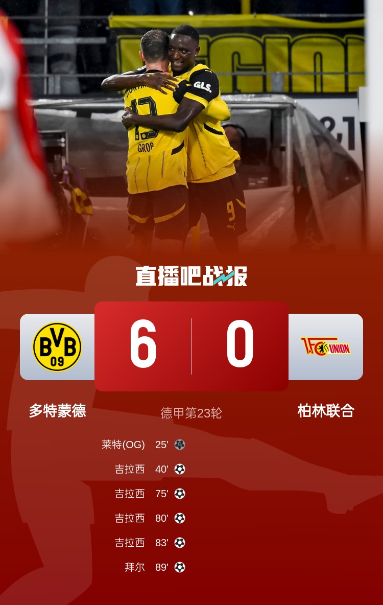 德甲第23轮,多特蒙德6-0大胜柏林联合,吉拉西大四喜,格罗斯4次助攻。