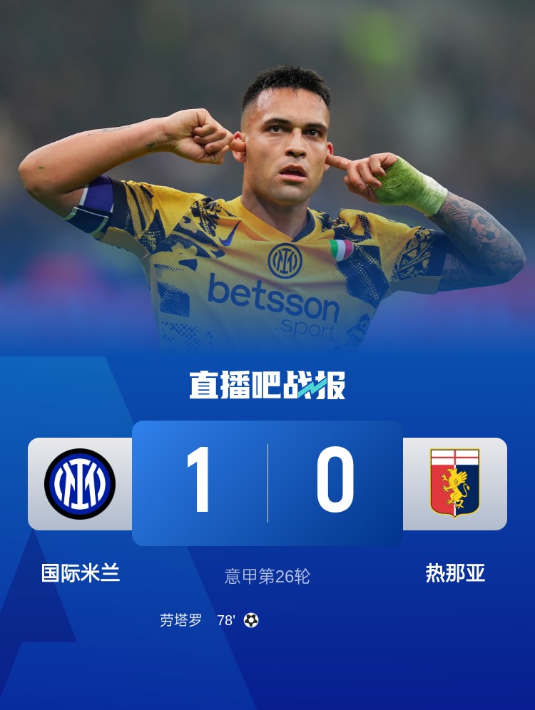 意甲第26轮,国际米兰1-0战胜热那亚,暂登顶,劳塔罗头球制胜。