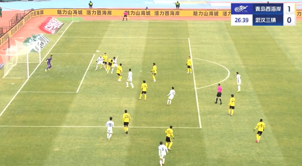 上半场补时3分钟,青岛西海岸1-0武汉三镇。