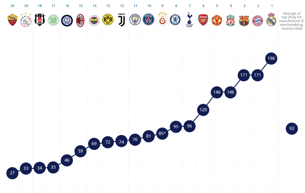 皇马在2024年依靠出售球衣等周边商品赚取了1.96亿欧元,这一数字在全欧洲断档领先,约占皇马全年总收入的18%。