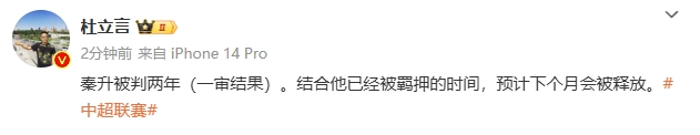 媒体人杜立言消息,秦升被判两年(一审结果)。结合他已经被羁押的时间,预计下个月会被释放。