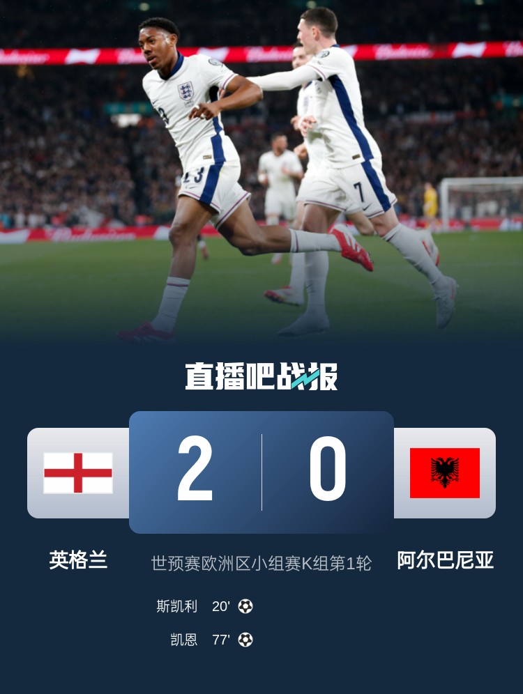 18岁斯凯利首秀迎处子球,凯恩斩获英格兰生涯第70球,英格兰主场2-0战胜阿尔巴尼亚。