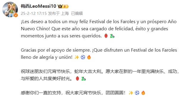 梅西微博中西双语发文祝福:祝球迷朋友元宵节快乐,蛇年大吉大利